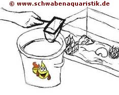 Einen sauberen Aquarieneimer mit heißem Leitungswasser ausspülen, damit Keime die am Eimer haften abgetötet werden und der Eimer gleichzeitig auf Temperatur gebracht wird.